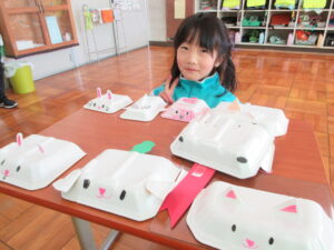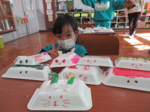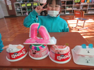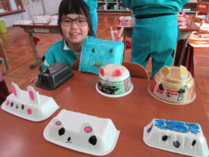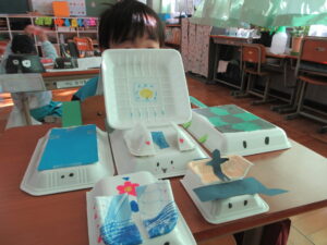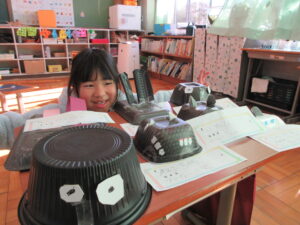3月13日(金)、不要になったトレイを用いて作品をつくりました。