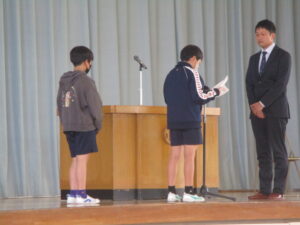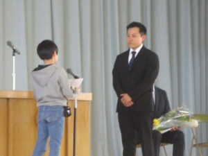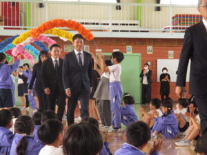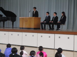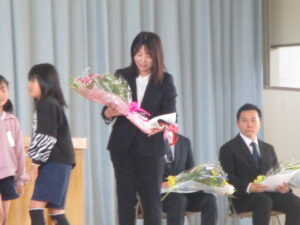 3月まで皆野小でお勤めいただいた先生方とのお別れの式、離任式を実施しました。今年は4名の先生方が、別の学校に移られました。先生方の話をしっかりとした態度で聞いたり、お手紙や花束を渡したりした後に、心に届くような歌声で校歌を送って、心に残る式となりました。よりよい皆野小にしていくことで、先生方の思いに応えたいと思います。