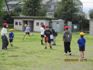 雨もやみ、6年生と一緒にみ~な公園まで歩き、遊具やグランドで、みんなで遊ぶことができました。