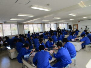 本日2年生が交通安全おまもり作りを行いました。このおまもり作りは、皆野高校が行っていた取組です。本日作成したおまもりは、生徒会本部役員が4月7日に皆野寄居有料道路の料金所で配布いたします。