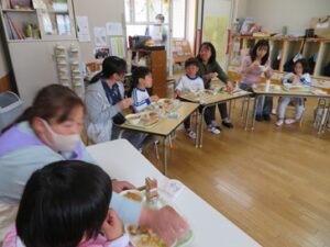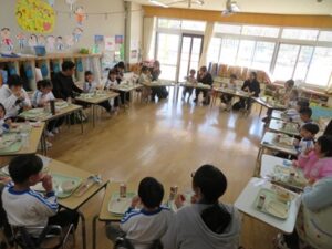 みんなで顔がみられるように円になって、楽しく給食を食べました。